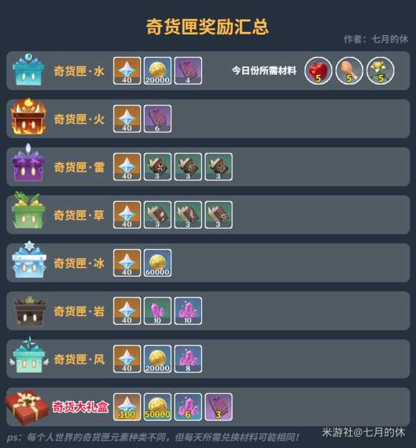 2.共有7种元素奇货匣,每个人的世界里的奇货匣种类不同,奖励也就不同,但兑换材料可能是一样的。