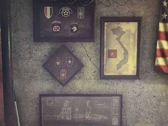 墙上挂满了道奇的荣誉勋章,旁边是越南地图。我不是军迷,但我也能看出下面的结构图肯定不是道奇的地堡设计结构图,说实话我觉得跟约瑟夫那帮邪教头领的地堡还有点关系。