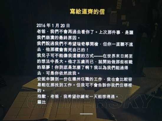2016年的写封信,暗示了道奇的某种偏执症(强行教孙子开枪)。这里编剧应该是刻意制造了一个对立关系,即罗比和道奇的矛盾,关系差劲到了儿子拒绝和父亲来往的地步,引导玩家对道奇产生一个具有反社会人格的印象。