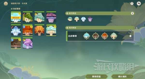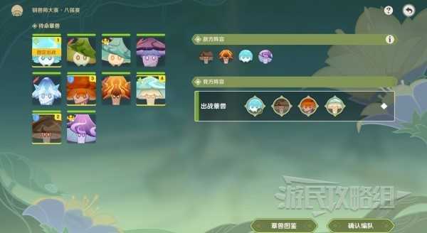 我方推荐阵容为:浮游水蕈兽(固定位,治疗)、伸缩岩蕈兽(主C)、旋转火蕈兽(元素反应)、伸缩风蕈兽(聚怪)。利用火蕈兽+风蕈兽聚怪+岩蕈兽输出,这场出战的3只蕈兽都具有范围输出能力,能够利用战技快速将敌人击败。唯一需要注意的就是对手也带有治疗水蕈兽,对手的续战能力会因此增强,所以优先击败对方的水蕈兽。
