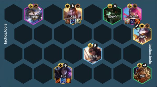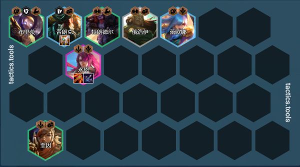 所有肉装都给杰斯打工使用,传统的3肉装反甲+龙牙,搭配狂徒或者石像鬼。如果没有来杰斯可以用布隆+蕾欧娜搭配2保镖羁绊,布隆挂在永恩旁边能够控制+保护永恩。