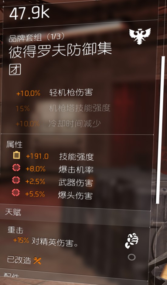 然后选的是彼得罗夫防御集团的一件套,套装提升10%的轻机枪伤害。