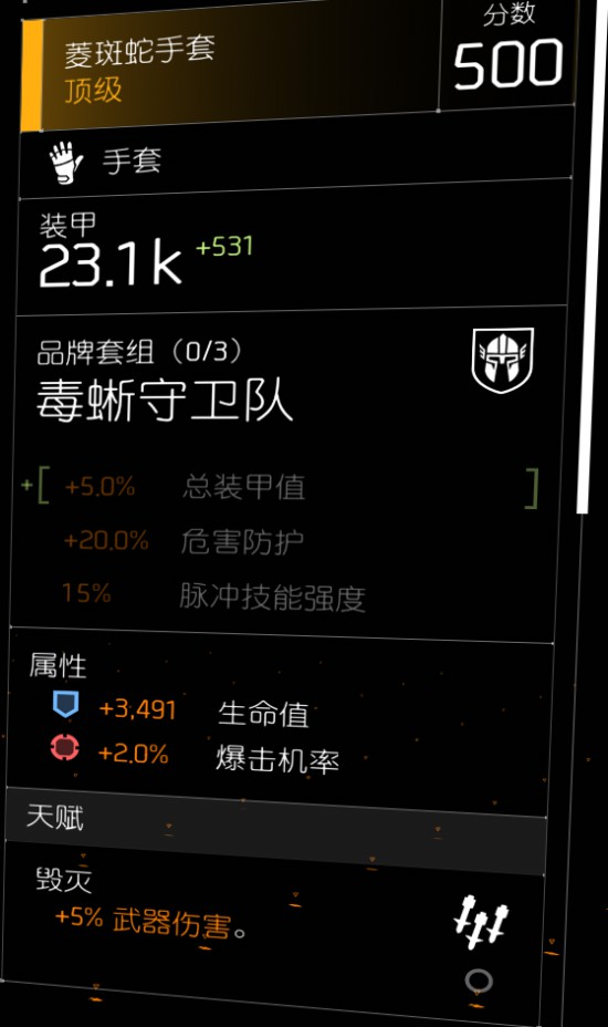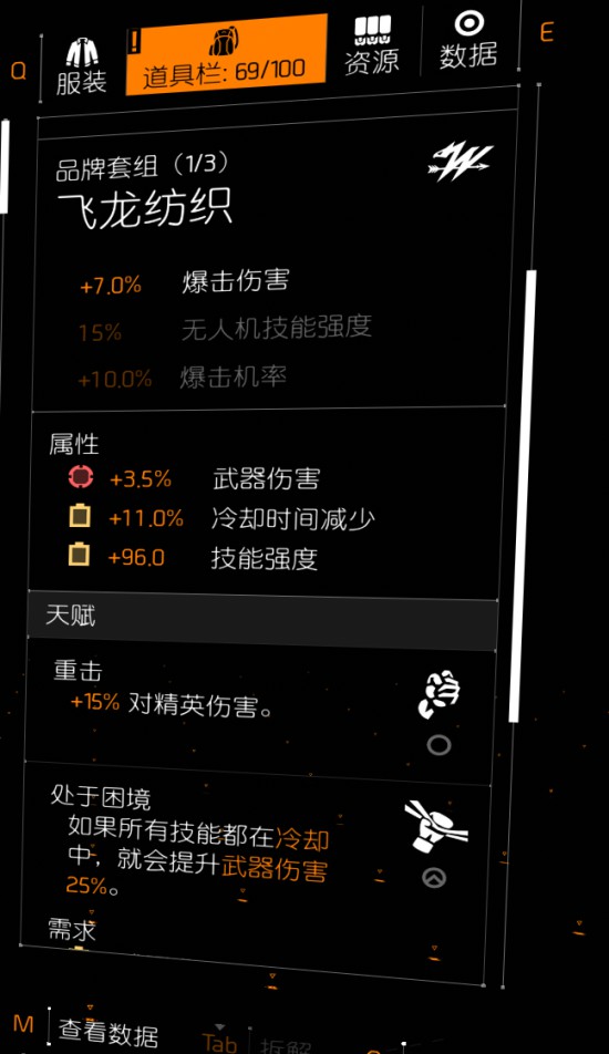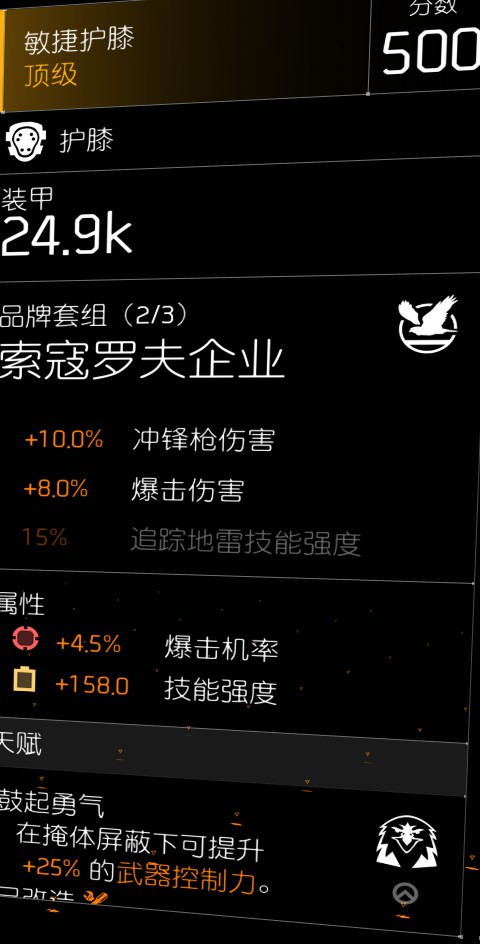 其次选的是索寇罗夫企业两件套,提供10%的冲锋枪副武器伤害和8%的暴击伤害,让你不至于在机枪子弹跳楼之后变成一个憨厚老实的特工,话匣子输出真的也不低的,特别是你用爆破专家。