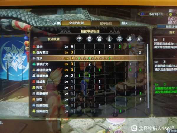 技能如下:攻7超会2弱特2装填2反动2贯3为核心技能,别的看着剩下几个孔自己插。