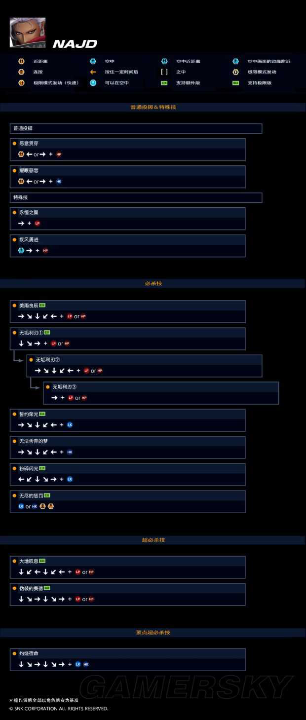 《拳皇14》娜吉德第二弹DLC追加角色的全新女性角色,其出身以及各个招式的按键很多玩家都还不清楚,下面就为大家带来《拳皇14》娜吉德人物资料及出招表一览,希望对各位玩家了解这名角色有所帮助!