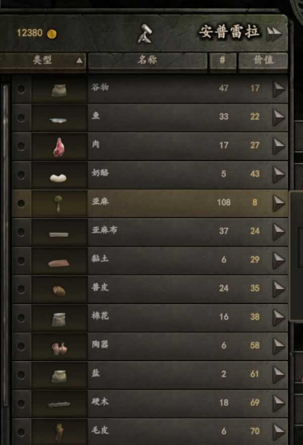 3、高价值物品,单价一般比较贵,而且卖出一部分后价格变动大,所以要多卖几个城镇,可以利益最大化。这里要说的是硬木和黏土在肖农附近价格比较低,可以做参考。还有一些没有列出的金属材料,是自己熔炼的,价格还是自己对比,我的几次跑商价格都变化比较大。