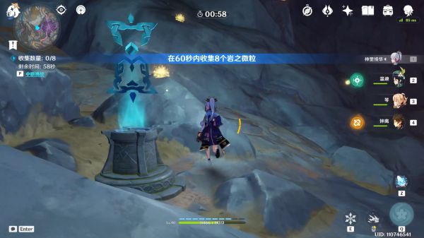 如上图所示,挑战内容为在60秒内拾取8个岩之微粒。