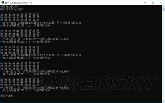 成品,下来双击打开就行了,直接输入自己的初始耐心按回车就行了,然后会显示前五名的读书方法,具体见下图: