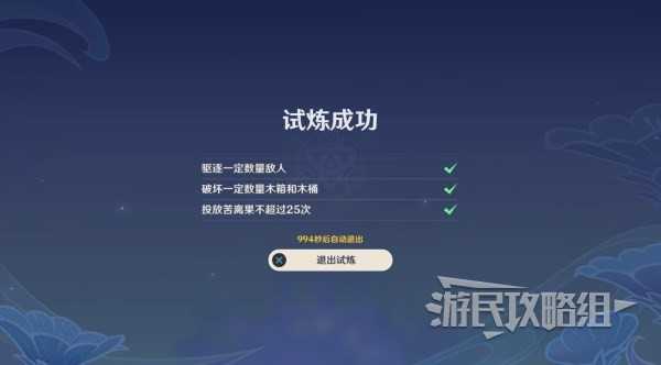 开始试炼后,先处理面前的区域和前方右侧区域。参考下图序号,先对①和②的荆棘投放苦离果把它们烧掉,然后对③的锅投放苦离果点燃,当大锅③旁边跑的两个丘丘人和生气花团④附近巡逻的丘丘人位置处于一条直线时对花团④投放苦离果驱逐四个丘丘人(这里如果前面两个巡逻的丘丘人总是走不到一条直线上的话,可以看准位置再放一颗苦离果补漏)。