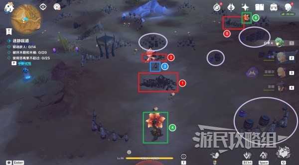 来到最后一片区域,先对①投放苦离果烧掉荆棘,然后分别对②的琥珀和③的电气水晶投放苦离果,让附近的丘丘人聚集在中间道路上,然后对花团④投放苦离果驱逐丘丘人(同样如果丘丘人总是不在同一直线上的话,可以看准位置再放一颗苦离果补漏)。周围紫色圈出的木桶和箱子等最后破坏数量不足时可以再回来补。