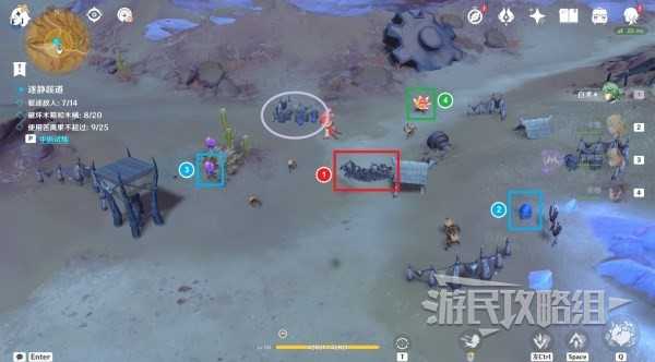 然后对荆棘⑤投放苦离果将荆棘烧掉,等花团⑥前方的4个丘丘人处于一条直线上时,再对花团⑥投放苦离果驱逐4个丘丘人。周围紫色圈出的木桶和箱子等最后破坏数量不足时可以再回来补漏。