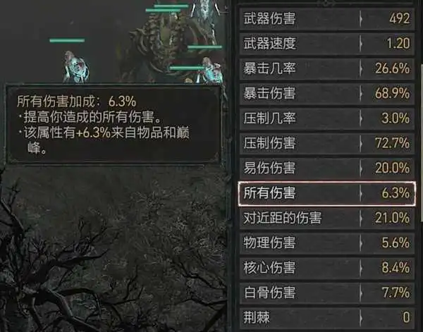 这就代表它可以享受到【核心】、【白骨】以及【物理类】增伤,而在游戏中这些增伤大部分显示在面板上。