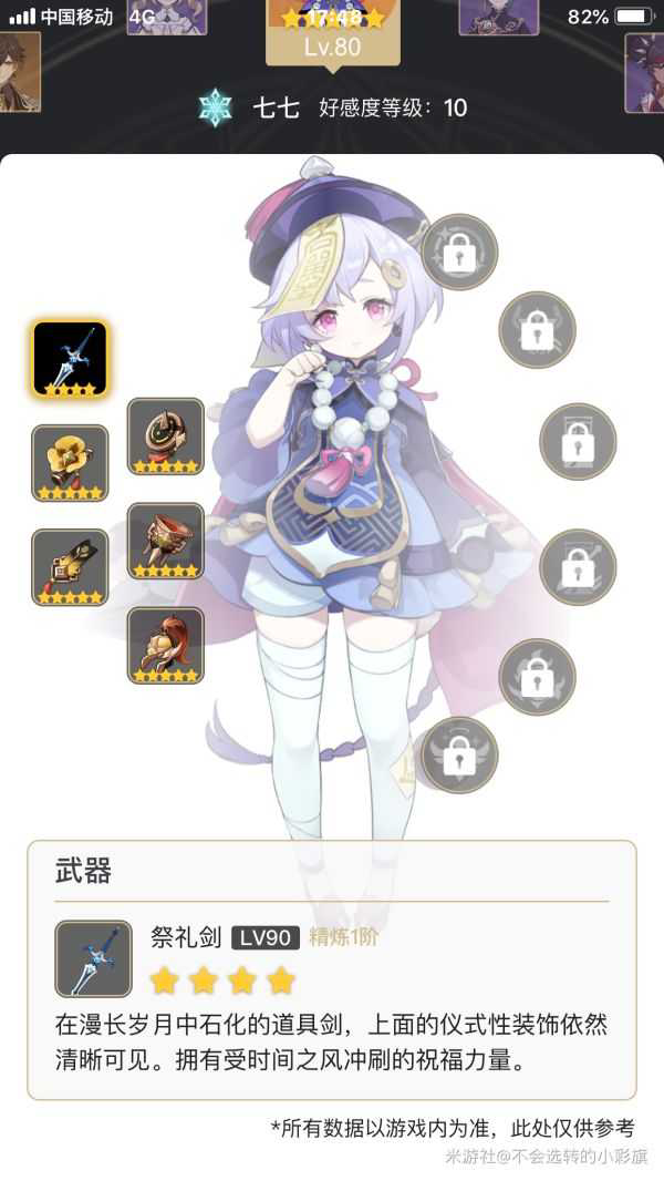 然后是七七,四千岩下的七七与其说是个奶不如说是个雷泽的超级工具人,常驻挂冰可以保证全程超导,那些内卷怪说什么猫挂超导也有12秒?喵喵喵???这些人摆明不是拿雷泽打深渊的,拿11层群怪举例,猫猫打出的猫爪满天飞,还有心思让雷泽去一个个看着猫爪飞到哪儿打嘛……还有满级雷泽打小怪两三下打死了,怪死了超导也没了……这个时候七七的作用就体现了,而且近战四千岩的效果可以一直吃到,雷泽(锅巴)就是最好的近战选手。而且七七本来就是本游戏奶量最顶尖的存在,带少女暗藏的杀意套装没啥用,带宗室套大招也基本开不出几个,千岩对雷泽输出相当于多了件常驻宗室,而且把祭礼剑的效果又拉高一个档次。