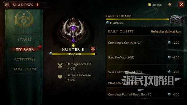 在位阶页面中,右侧会显示每日任务和挑战任务,完成后即可获得位阶分数。这些任务中也包含暗影会的其他活动,例如密谋、突袭宝库等。