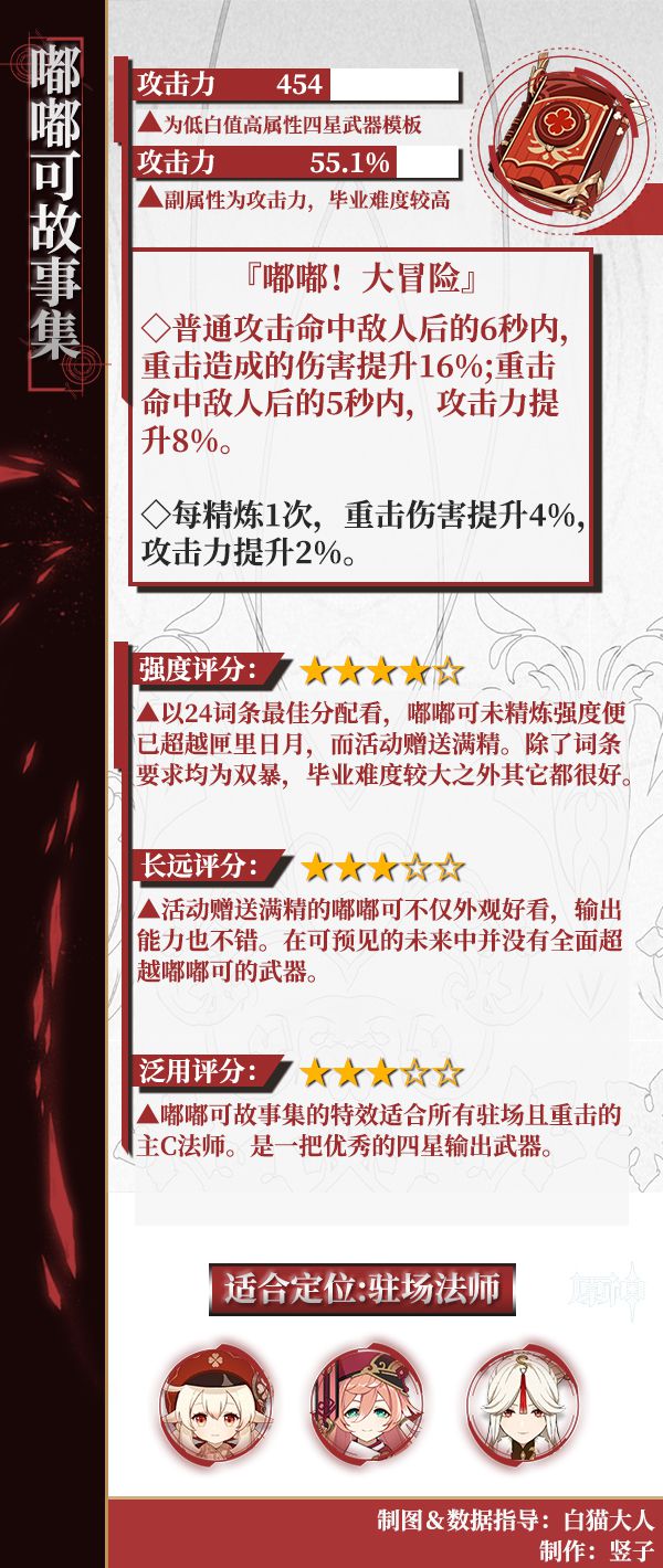 嘟嘟可故事集是一把四星法器,有着不错的攻击加成属性。那么这把武器的强度如何,输出伤害高不高,请看下面由“竖子”带来的《原神》1.6版嘟嘟可故事集强度评析与输出数据对比,一起来看看吧。