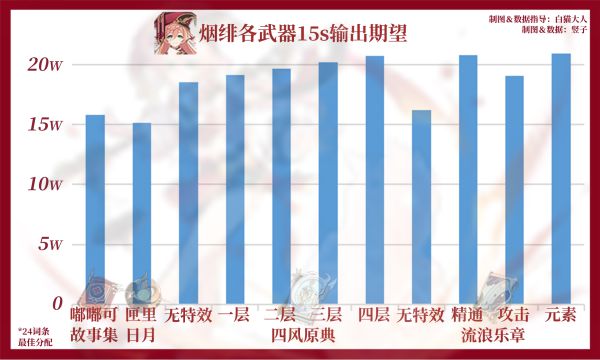 此处烟绯以15s为周期是因为烟绯的大招灼灼效果持续15s,灼灼效果对烟绯的输出提升十分显著。取15s中烟绯释放一次大招,两次战技,六次重击,四次普攻一、二段,法兽灼眼的计算结合武器考虑暴击。
