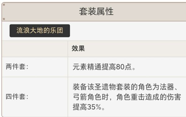 此套装适合没有行秋的旅行者且兼顾小额元素反应,不需要复杂的配队和复杂的输出手法,限制性小,但伤害上限较魔女套低且获得困难,如果旅行者有较好的乐团套装且无行秋那这就是最优解。