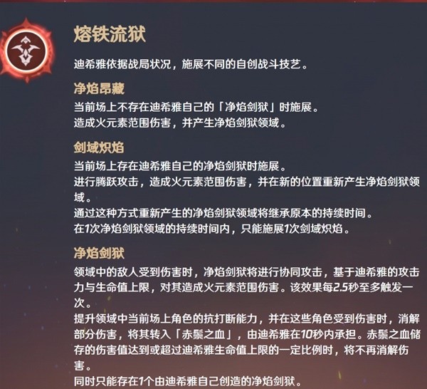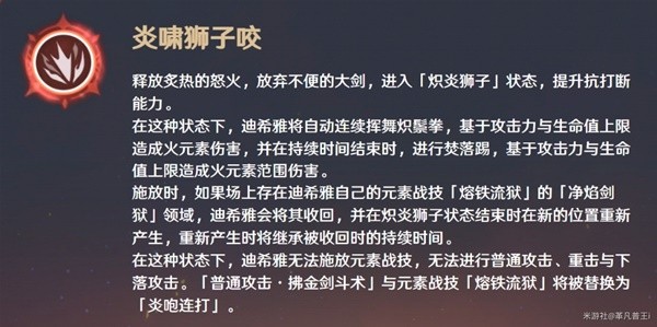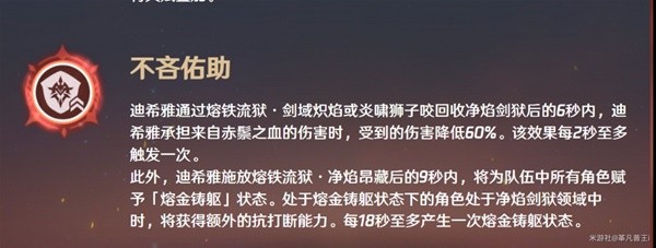 是一个后台挂火/辅助类型的技能。e每次挂的火均为弱火。迪希雅施展的领域提升的抗打断能力在前9秒抗打断系数约为0,后面约为0.7(系数越小,抗打断能力越强)。祭礼不会刷新真霸体时间,真霸体每18s最多触发一次。【存在真霸体的情况需要解锁固有天赋:不吝赐助】