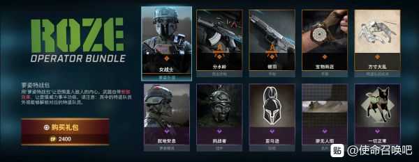 商店更新萝姿特战包,玩家花费2400使命召唤点数即可购买包含特遣队员外观、武器图纸、手表、处决、嘲讽、挂件、贴纸、名片和徽章的礼包。