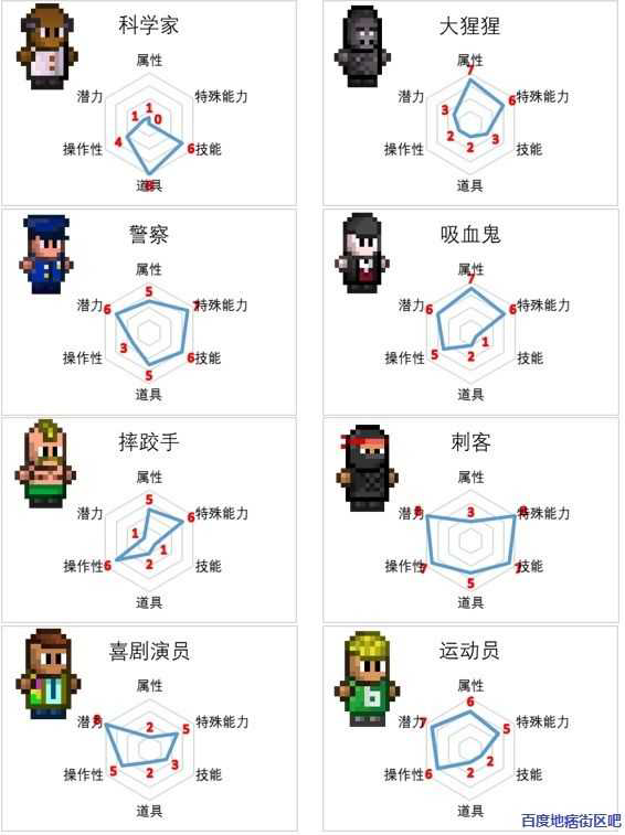 潜力:潜力在一定程度上决定着一个人物的上限,在这个版本由于特化技能的引入(也就是只有升级时候能见到的对特殊能力进行强化的黄颜色技能,比如喜剧演员的特化技能“故事戏剧”能提高喜剧演员笑话的成功率,强化后甚至能让笑话成功率变为100%,直接拯救了这个人物),部分有着特化技能的人物(刺客、喜剧演员、警察、僵尸、黑客之类)的潜力会有一个较高的分数。而贫民这种虽然没有特化技能却有着成长性技能的人物也有6分的高潜力。潜力还有一个考虑因素就是一个人物的后期能力,典型代表是店主,凭借无限刷钱的随身贩卖机直接得到8分满分潜力。