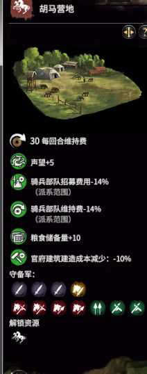 共减少骑兵招募费42%还有维持费42%,现在的骑兵几乎可以用不要钱形容(我这里点了红色改革,减少招募费用,三级马场还是需要一点招募费的)。