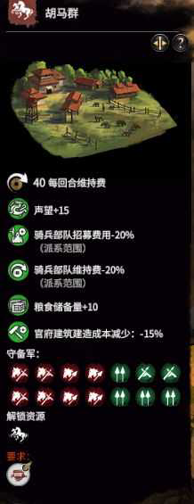要是在配合改革的解锁马场升级,三马场升五级叠加加成后,减少60%招募费和维持费。改革路线上有减招募费的科技,一套操作之后就可以达到上图的零招募费。
