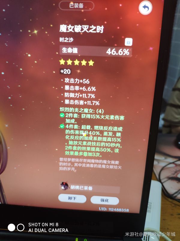 3.这也是我这帖子最想说的,圣遗物,胡桃圣遗物有各种各样,4魔女4流星,魔女乐团2+2,魔女千岩2+2。这里主要说明4魔女和魔女乐团2+2的差别。