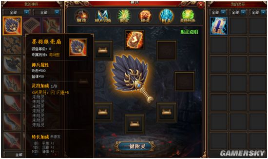 1.聚灵:神兵灵符可通过聚灵获得,聚灵将消耗器灵,器灵可通过熔炼装备获得。