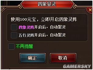 2.四象显灵:可消耗100元宝直接激活四象灵阵,激活后可选择手动聚灵或自动聚灵。