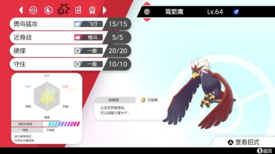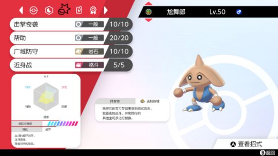 另一方面,极巨化只有三个回合,战舞郎不错的耐久、威吓的特性,配合携带的逃脱按钮,通过轮转也是消耗对手极巨化回合的不错的对策。剩下的两个技能选择很多,佯攻、劈瓦、突袭都是很好的选择,我这里选择了帮助和广防。我多次遇到剩勇士鹰和战舞郎残局的情况,帮助可以帮助勇士鹰确定秒杀对手一只宝可梦;广防在面对煤炭龟喷火、班基拉斯地鼠岩崩时也有很好的效果。