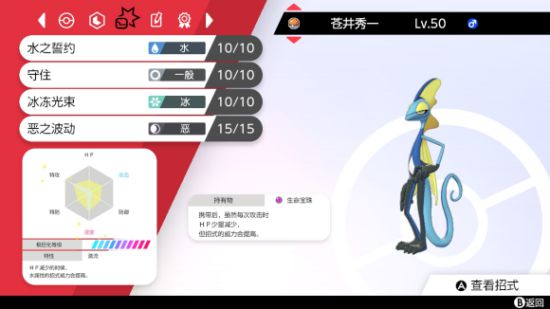携带命玉的水主,水草誓言打到非抗草、耐久不是非常优秀的宝可梦时,基本能够达到秒杀或者打出腰带。其他技能的选择,更多的是考虑到打击面,本身水主的技能学习面也不广。冰光打勇士鹰、除草机之类,恶波打钢钟或是多龙等。在选出上,基本上都是和银伴战兽一起选出,但在遇到中速、非空间的队伍时,也有单独选出的情况。