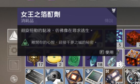 第四个碎片,需要喝下女王箔酊药剂(幽梦之城开四处的宝箱或者打遗失区域可以获得)后,推荐大家去涅索斯的人造物之崖(神器止境)里面的遗失之地星仪(太阳系仪),里面vex很多,一发火箭筒下去就是好几个。