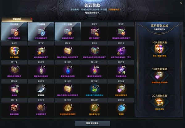 伴随新版本的到来,从12月20日起,游戏内将上线全新签到奖励活动,精炼材料、银币、染色剂、航海硬币、战斗道具综合箱子和交易牌等实用道具签到即可免费获取,当签到次数到达20次时还可以领取【传说卡牌包】!冒险家们要记得每日上线领取签到奖励哦~