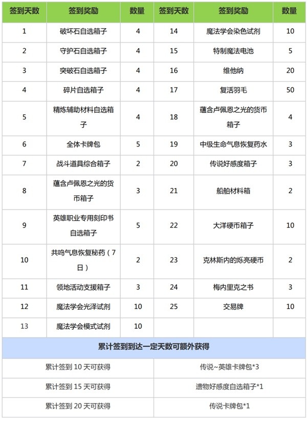 以下为本次签到活动中详细的奖励类型与数量,本次活动奖励单账号仅可领取一次: