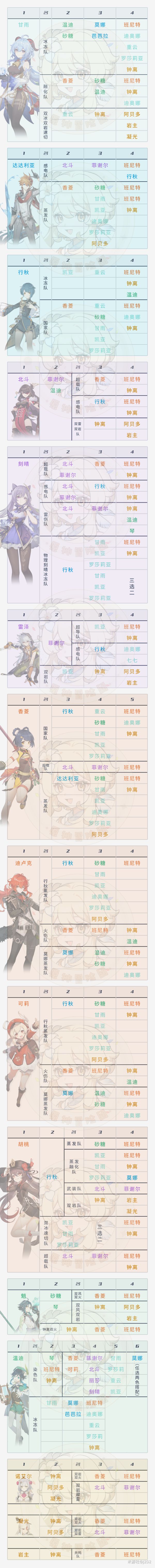 然后确定深渊上下两层队伍,本期12层没有需要破盾的地方,唯一要注意的就是12-2的讨债人的火抗、雷莹的雷抗、冰莹的冰抗以及冰盾、12-3的小宝、遗迹重击的物理抗性。上层可以【胡桃、行秋、砂糖、班尼特】或者【香菱、北斗、菲谢尔、班尼特】或者【香菱、行秋、重云、班尼特】或者【香菱、达达利亚、砂糖、班尼特】,下层可以用温迪、莫娜、甘雨、迪奥娜冰冻队。