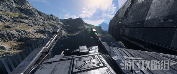 在任务尾声中,来到一片庭院,这里有很多建筑、一艘坠毁的飞船和着陆点。用抓钩飞到飞船的上边,找到两个炮台。