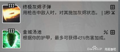消耗大师:上面说到的配合细柳的灰烬效果,用来对精英打爆发伤害,技能或者近战上燃烧之后再补一枪就可以完美触发消耗大师的效果。