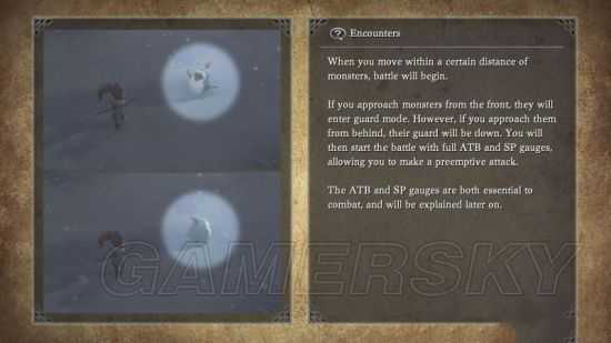 如果你在正面接近敌人,他们会进入防御模式。然而,如果你是从后靠近它们,它们的防御就会降低。你将会在战斗开始时蓄满ATB和SP槽,这样就可以让你获得优先攻击权。