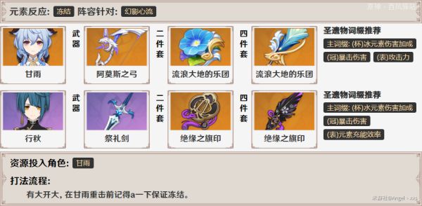 今天的队伍推荐就只有一套了,毕竟极限和奥传的差别就在是否刷新遗迹重机上面。我比较推荐的是使用永冻流,以甘雨行秋或者神里行秋为核心来完成持续冻结。我推荐甘雨优先,因为弓箭角色比较容易击破遗迹系列的核心,心流机制让遗迹系列只需要击破一次核心就能陷入瘫痪。