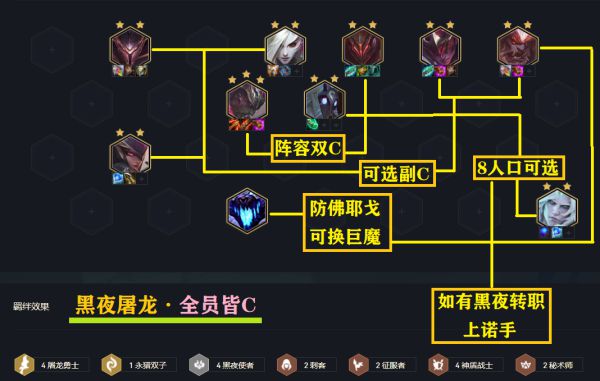 阵容运营关键羁绊:4黑夜+4屠龙。阵容双C亚索、铁男。