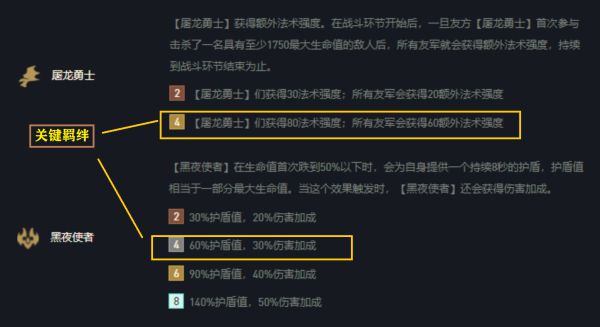 3-2左右拉6人口,这时候可适当D卡,阵容开始向黑夜屠龙转换,添加3神盾羁绊,但这时候注意屠龙羁绊只是给屠龙棋子增加法强,很难触发全员增加法强的收益(棋子血量很少超过1750)。
