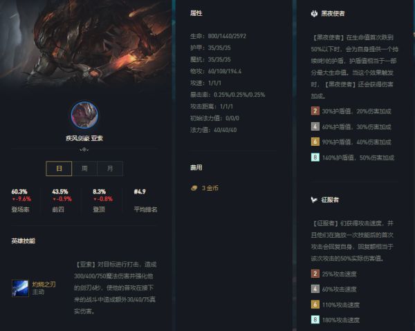 亚索是这套阵容主要输出棋子,在第一次释放技能后,普攻携带真伤,且真伤可随着技能释放叠加,携带法爆后亚索普攻真伤还可暴击,强度非常高。这版本亚索还增强3星技能伤害,3星技能搭配法爆基本稳定秒敌方棋子。再者亚索搭配4黑夜羁绊半血后有高额护盾,生存能力也有保证。