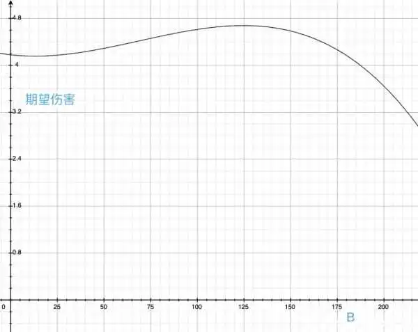 进攻属性资源为150个单位是,期望伤害 与 分配给暴击乘区资源数量B 之间的关系