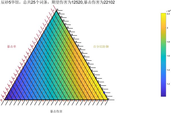 三种词条总数为25时,令百分比防御词条少于8条,暴击率多于4条,爆伤多于8条,就可以使得刹那之花的伤害期望基本达到1.4万。最佳属性是只堆双爆,暴击率75%,爆伤150%,此时刹那之花伤害期望达到14425。具体如下图所示。