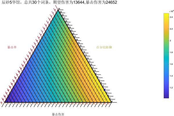 三种词条总数为30时,建议百分比防御少于10条,暴击率多于5条,爆伤多于10条,此时伤害期望基本达到1.55万。最佳面板是只堆双爆,暴击率为85%,爆伤为170%时,伤害期望达到16596。