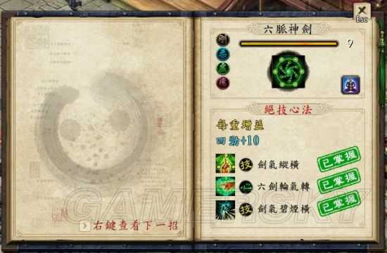 六脉神剑:关键在于升级只能用于看秘笈,所以升级速度相当慢(还得把丹青练满)。