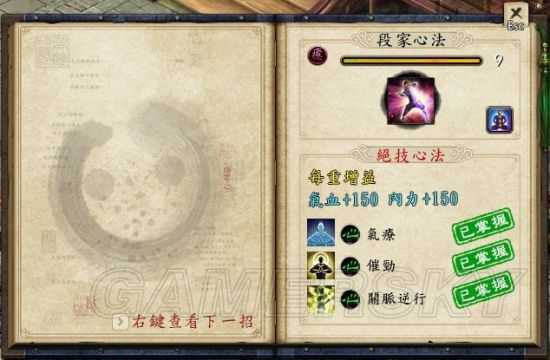 剑气纵横:主攻技能,气功与招架增益,唯一可惜是没有无视。