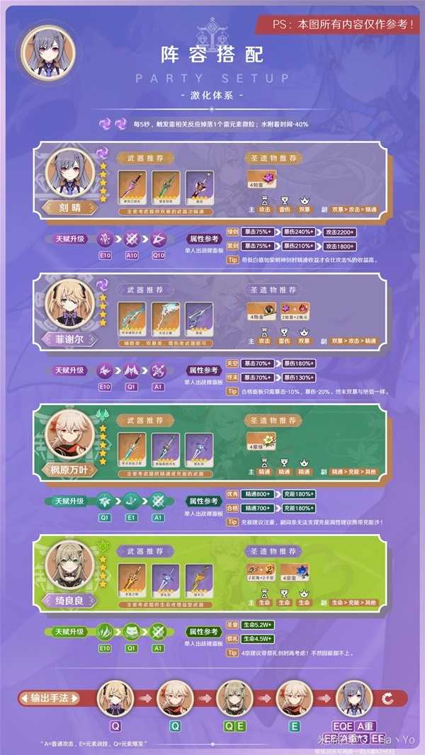 刻晴拥有多段低倍率加上高频附着的特性,使激化反应对刻晴的增伤收益比较可观。所以,目前刻晴的主要阵容体系便是激化体系。天赋升级建议是优先A其次E最后Q,或者三者同时升级。