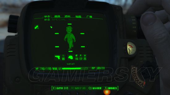 目前状态LEVEL121,什么随从也不带,动力甲不穿,见什么拿什么,只用.45爆裂,看到交易中心,上去买光,卖纯水,黏合剂