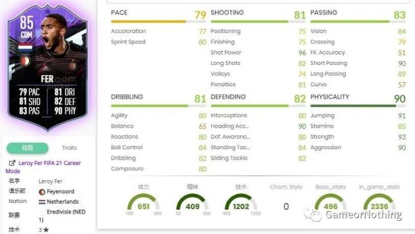 这张卡最大的问题就是加速慢+低平衡,转身回追慢,被打反击会比较被动,只能控制中卫/边卫先挡一下,等他防守到位。但正面防守,区域防守都不是问题,断球成功率很高。但不要忘了这张是what if 卡,还有机会升级。如果费耶诺德在未来5场荷甲联赛中至少打入6球,这张卡的总评将+2,届时速度和盘带都会上涨,再吃一个影子,整体手感会好很多。